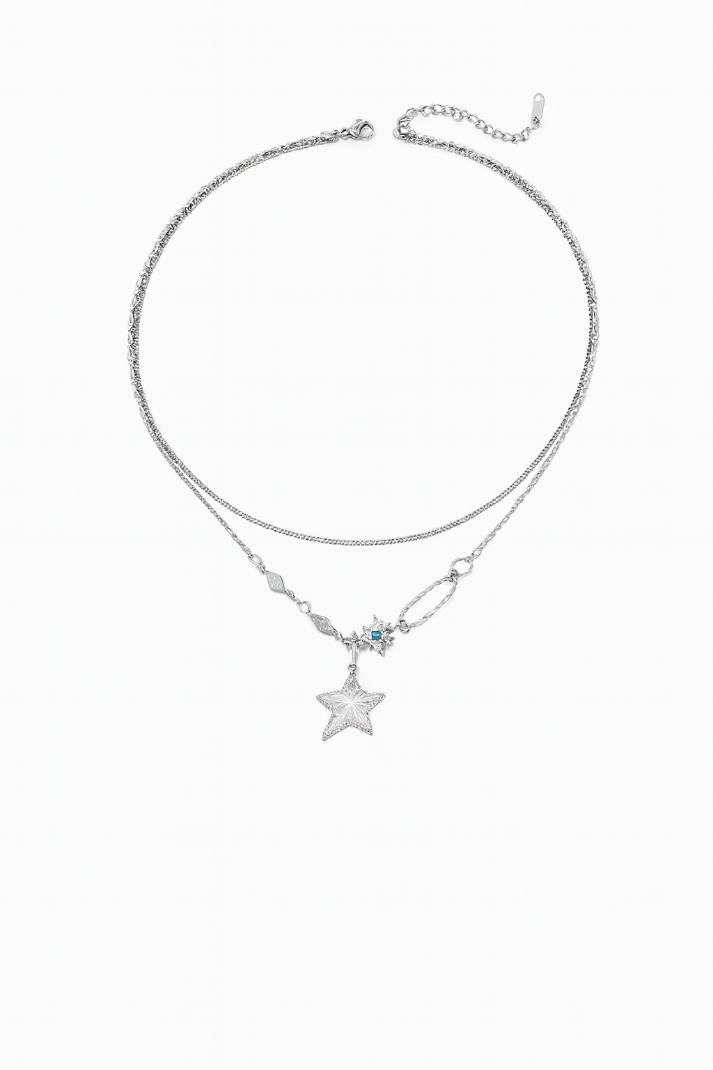 This silver-plated stainless steel necklace comes in a refined double-layer style finished with a five-point star pendant and subtle zircon details. A simple yet eye-catching piece suited for everyday wear and more dressed-up moments.